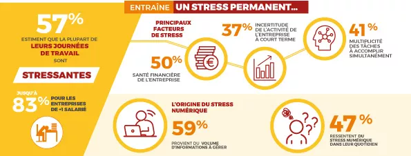 Les principaux facteurs de stress sont la santé financière de leur entreprise (= à 50 %) vient ensuite l’incertitude de l’activité (↓ à 37 %) et la multiplicité des tâches à accomplir simultanément (↑ à 41%).